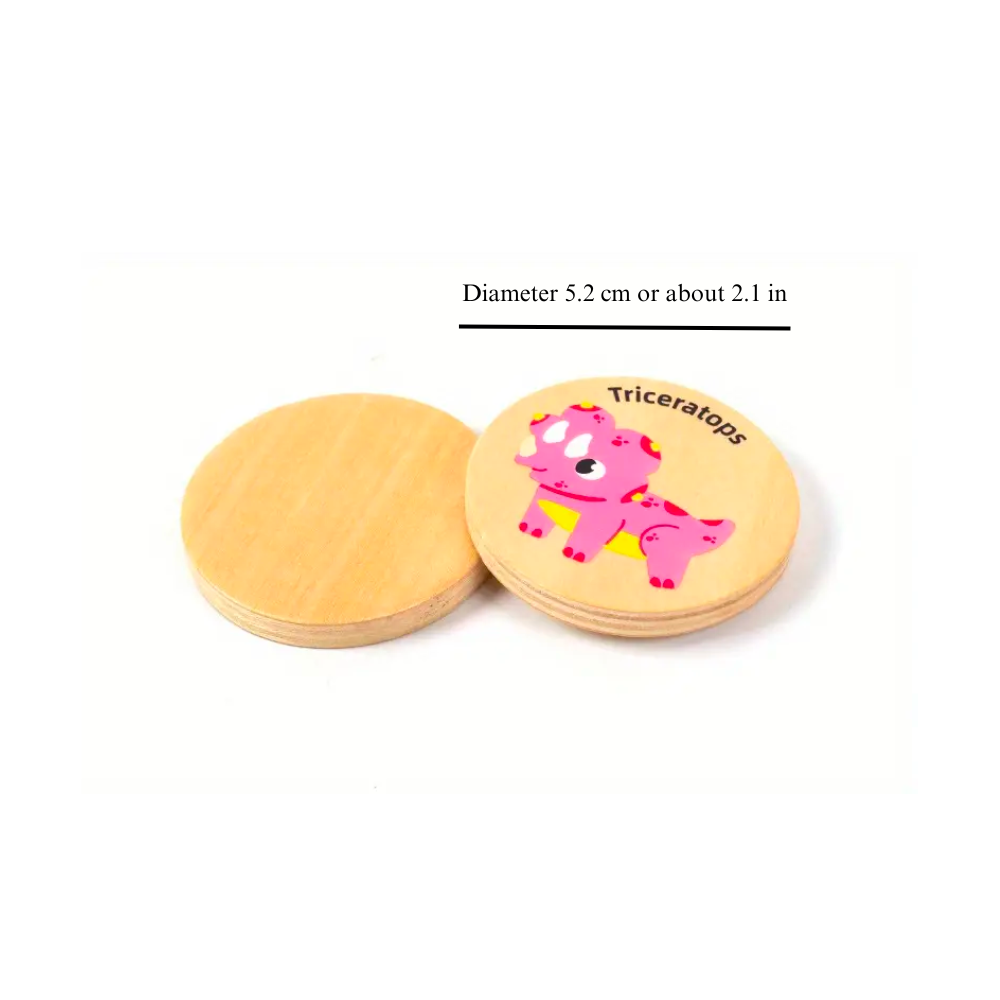 • The diameter of the "dinosaur-themed" wooden pieces are 5.2 cm or about 2 in.