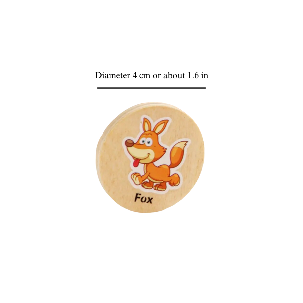 • The diameter of the "animal-themed" wooden pieces are 4 cm or about 1.6 in.