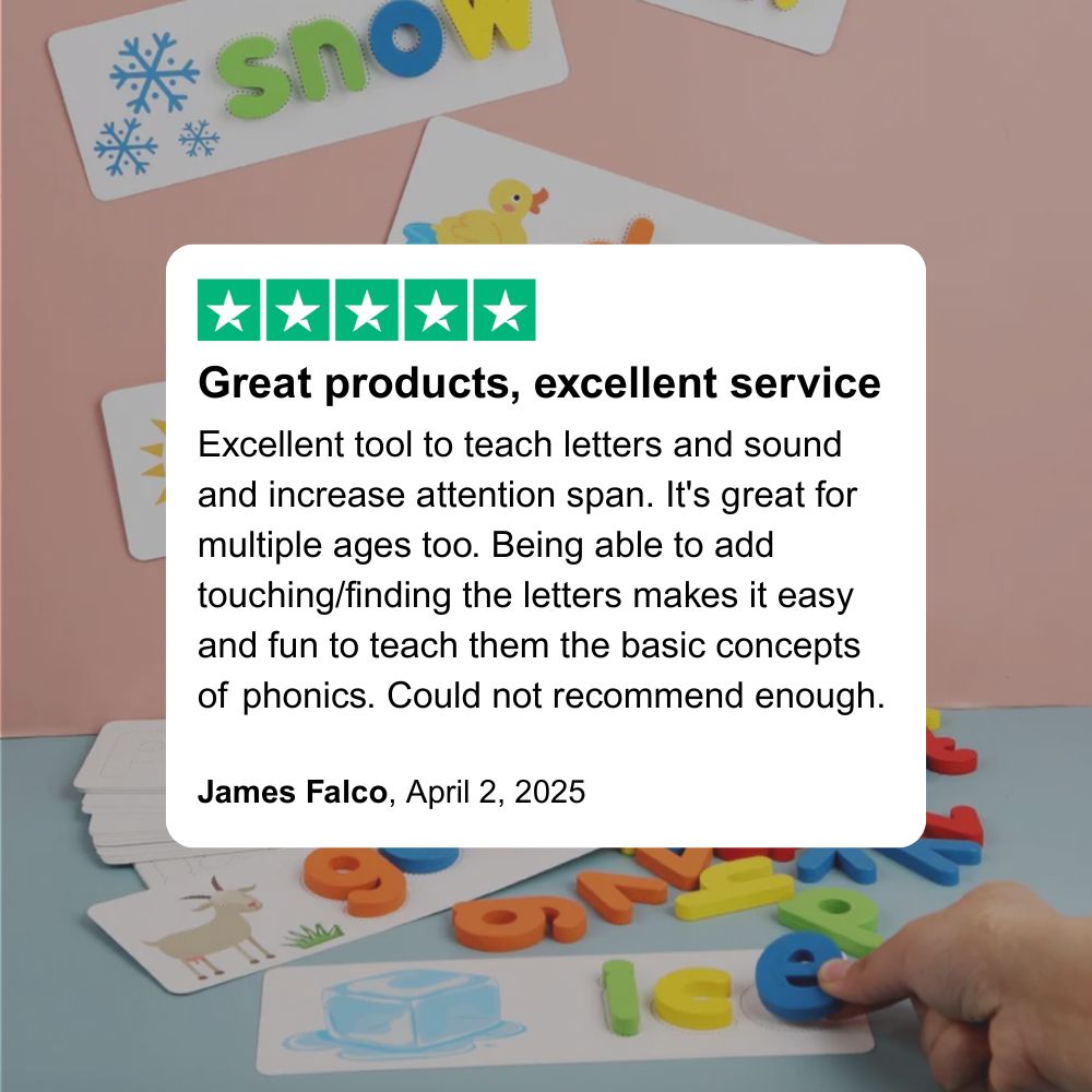 The set includes over 50 word cards and a complete set of alphabet letters, with duplicates of common letters to allow multiple word formations at once. This gives your child hours of engaging, educational play.
